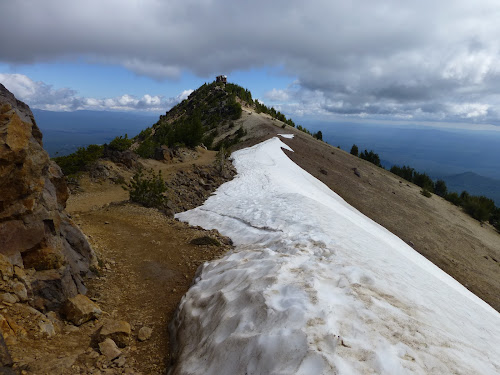 Mount Scott sits on the east side of the lake and at 8,929 feet in elevation it is 900 feet higher than Garfield and Watchman Peaks. This trail is a gradual uphill hike from bottom to top, and over the course of 2.5 miles to the top we will gain about 1,250 feet. The mountain is shaped in a semi-circle facing the lake and we can see from the beginning of the trail there there is still a fair amount of snow around...we cross a few patches right away and then begin our ascent...the trail will take us around the back side of this semi-circle then up to the top from the east approach...